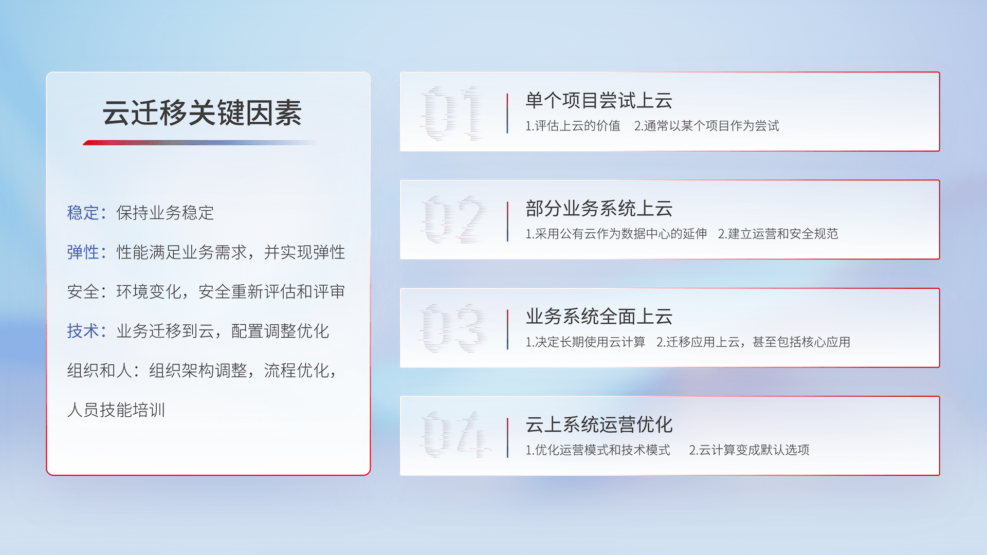 结合实际业务,,,,从规划设计、、、、云平台选型、、、、云原生改造、、、、数据迁移、、、、集成交付,,,迁移全过程为客户识别最佳上云路径,,做好风险识别管理,,设计网络架构、、、、身份权限、、、、安全审计合规、、操作审计、、、、日志审计、、、监控告警策略、、、、多站点容灾设计等,,,对云上基础设施进行整体规划,,提升IT治理水平,,以满足弹性、、、高可用、、、高性能的需求。。。。